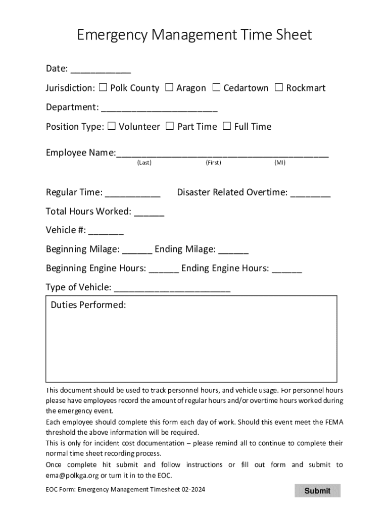 This document is used to track personnel hours and vehicle usage during emergency events, requiring employees to record regular and overtime hours worked.