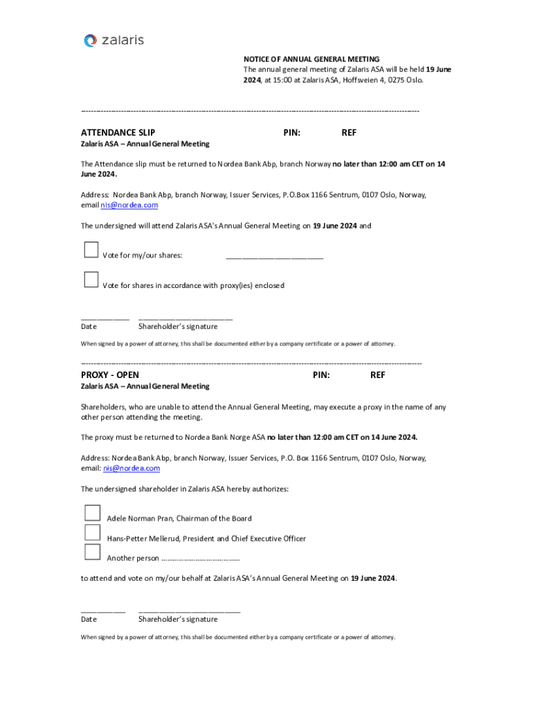 This document serves as a notice for the annual general meeting of Zalaris ASA, providing details on attendance, proxy authorization, and voting instructions for shareholders.