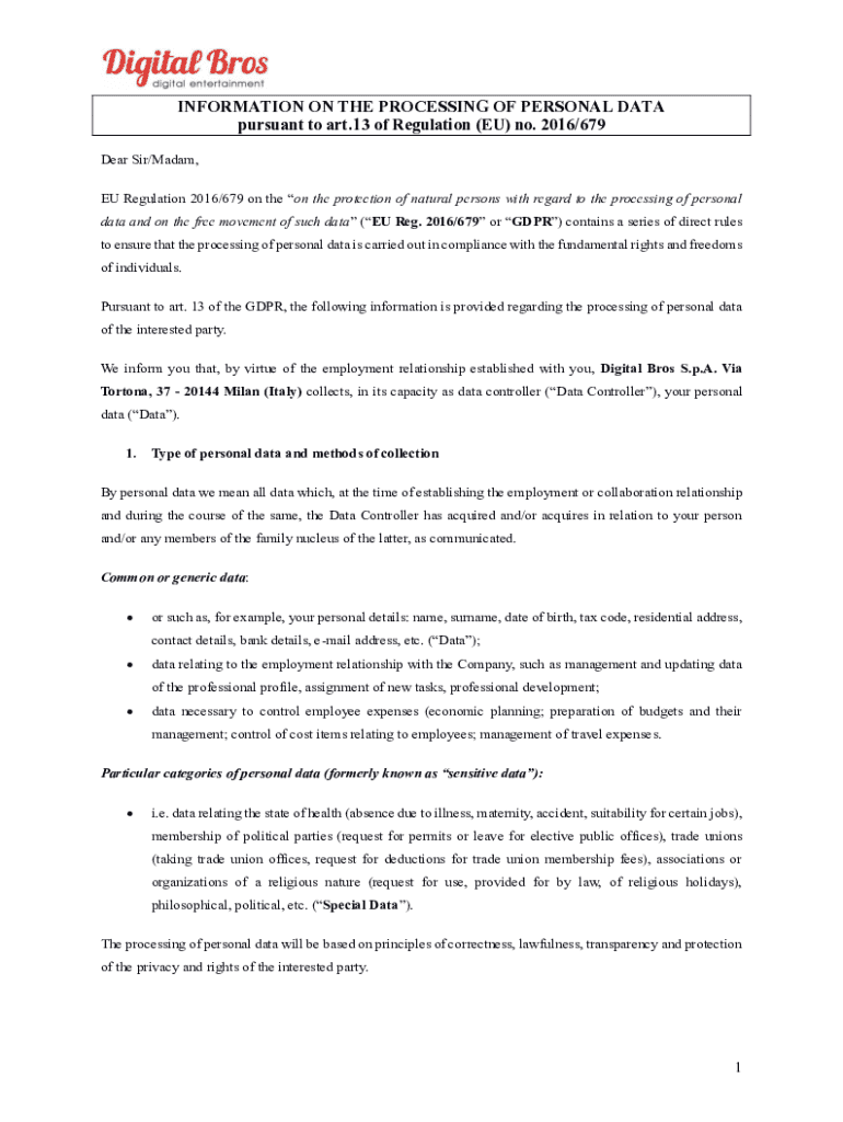 This document provides information in compliance with EU Regulation 2016/679 (GDPR) regarding the processing of personal data of employees by Digital Bros S.p.A., including the types of data collected,