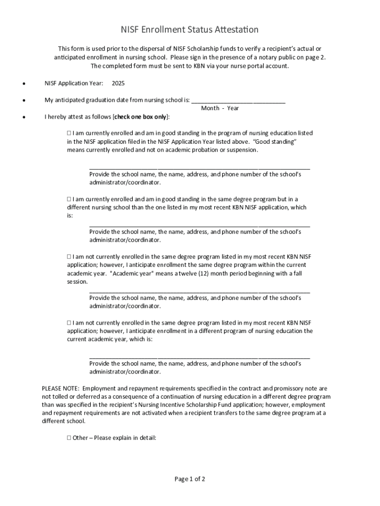 The NISF Enrollment Status Attestation Form is a crucial document designed to verify a student's enrollment status in an educational institution. This form plays an integral role in various academic and financial processes, including financial aid applications and scholarship eligibility assessments.