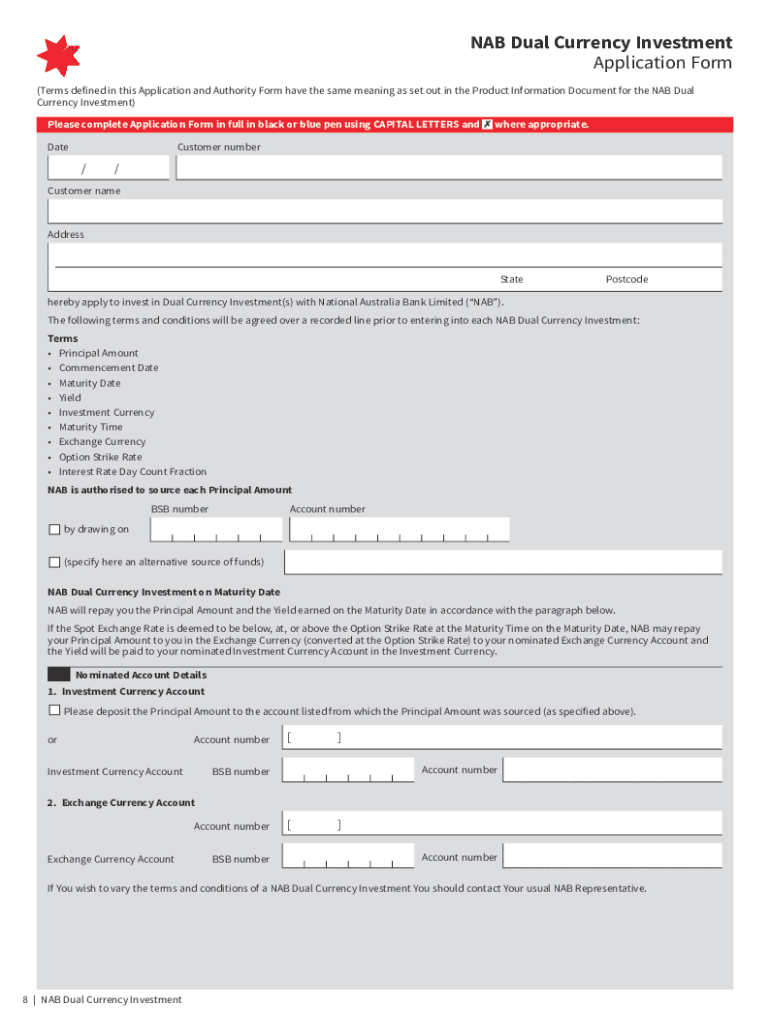 Step-by-step instructions for completing the NAB Dual Currency Investment Form