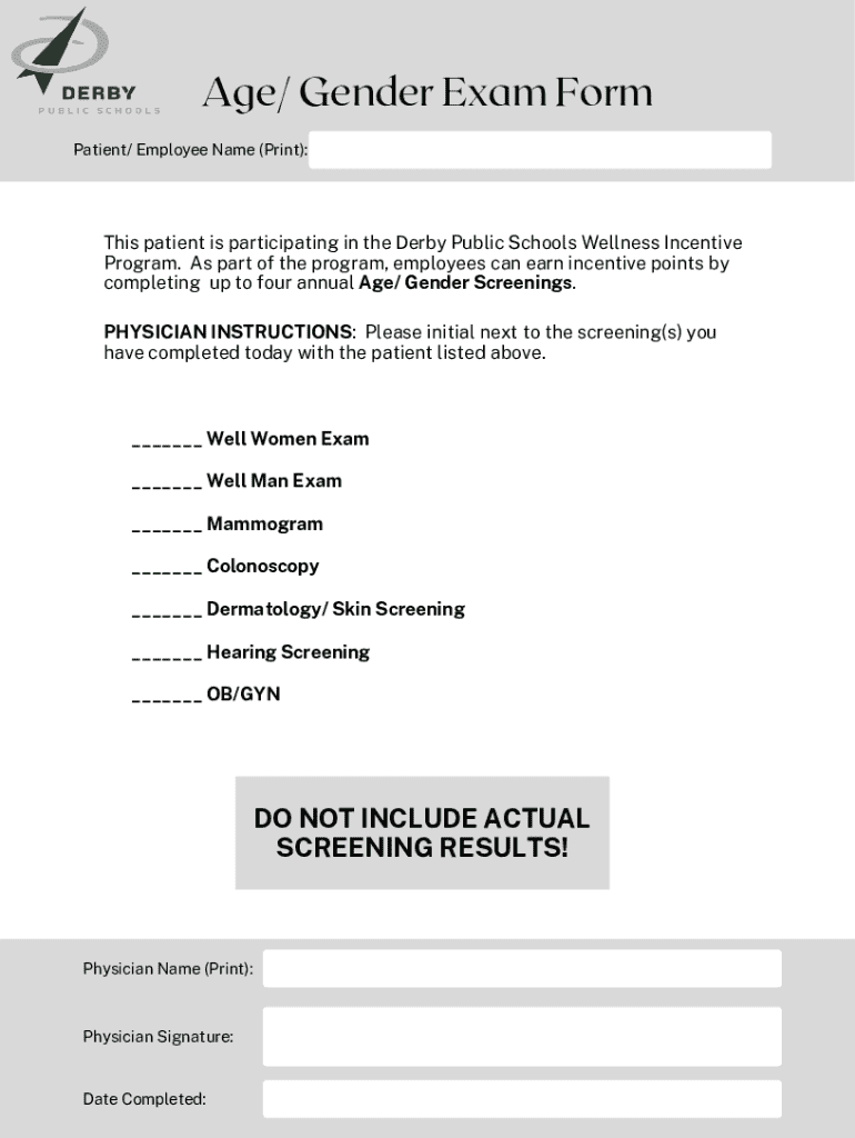 This form is used for participants in the Derby Public Schools Wellness Incentive Program to document completed Age/ Gender Screenings by a physician.
