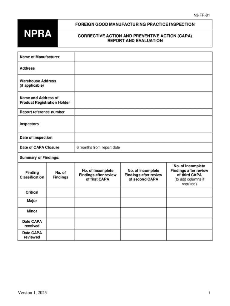This document serves as a Corrective Action and Preventive Action (CAPA) report and evaluation for foreign manufacturers, detailing the inspection findings, corrective actions taken, and the evaluation