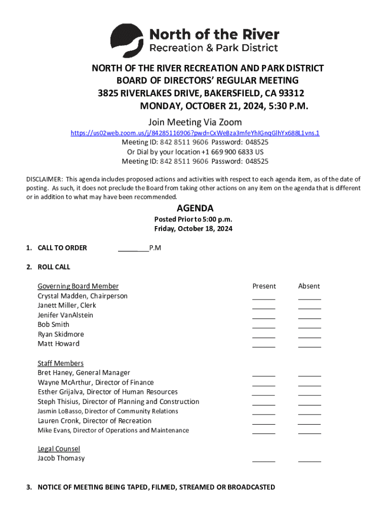 Get the free North of the River Recreation and Park District Board Meeting Agenda