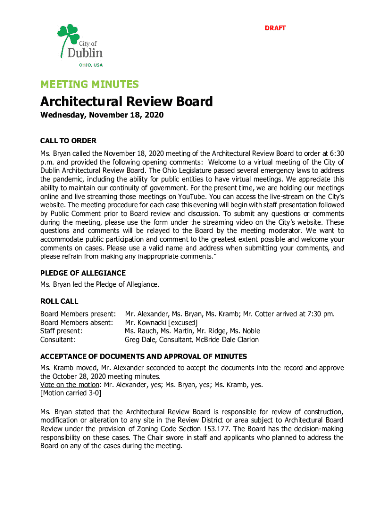 Minutes from the Architectural Review Board meeting held on November 18, 2020, including discussions on consent cases, public comments, and updates on the Historic District and Zoning Code.