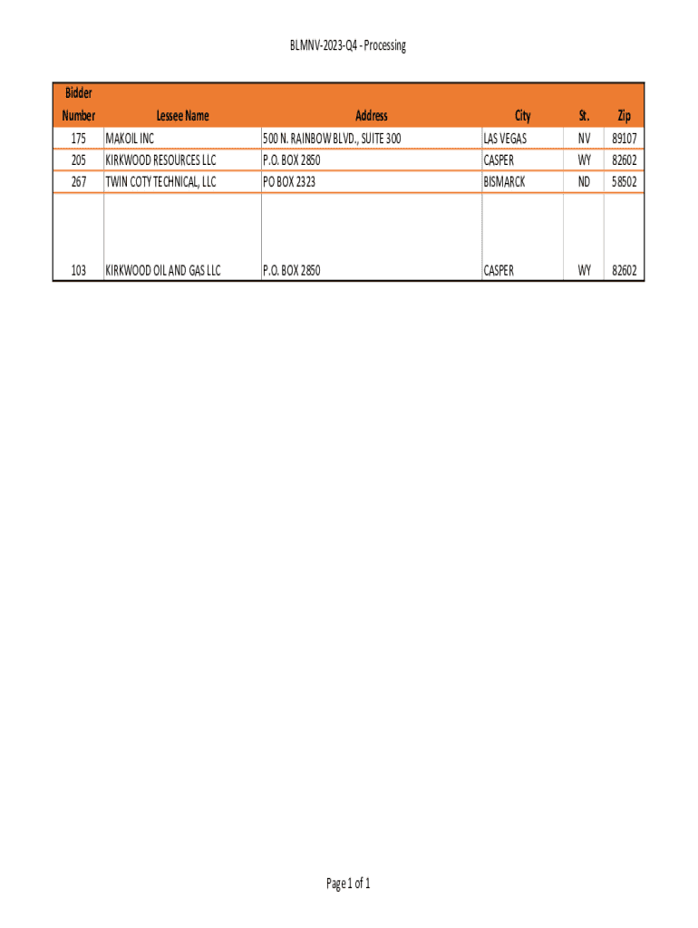 BLMNV2023Q4 Processing Bidder Number 175 205 267103Lessee Name MAKOIL INC KIRKWOOD RESOURCES LLC TWIN COTY TECHNICAL, LLCAddress 500 N. RAINBOW BLVD., SUITE 300 P.O. BOX 2850 PO BOX 2323City LAS VEGAS