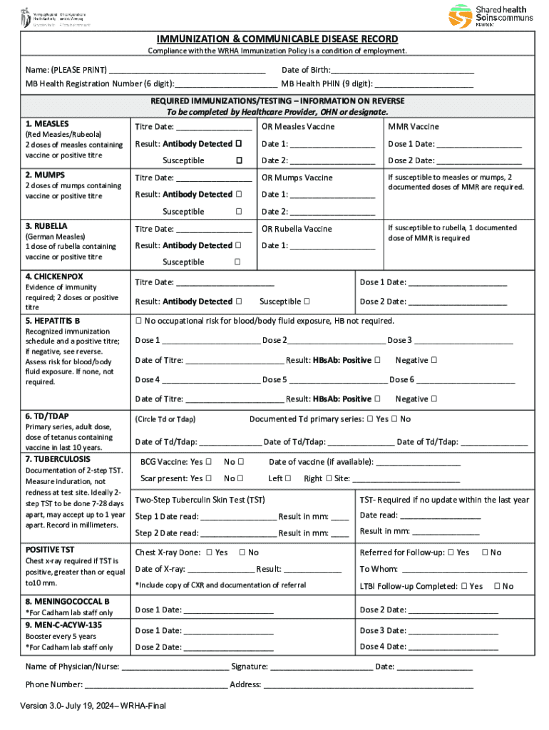 This document records the immunization status and testing results for compliance with the WRHA Immunization Policy, required for employment in healthcare roles.