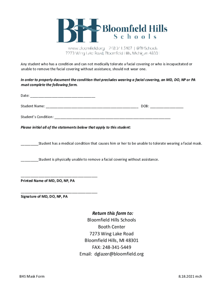 The BHS Mask Form serves as a vital component in various sectors, particularly in educational institutions, healthcare facilities, and corporate environments. This form is designed to capture essential information required for compliance and documentation, making it indispensable for accurate record-keeping. Its significance extends beyond mere paperwork, as it ensures that users adhere to specific guidelines set by regulatory bodies.
