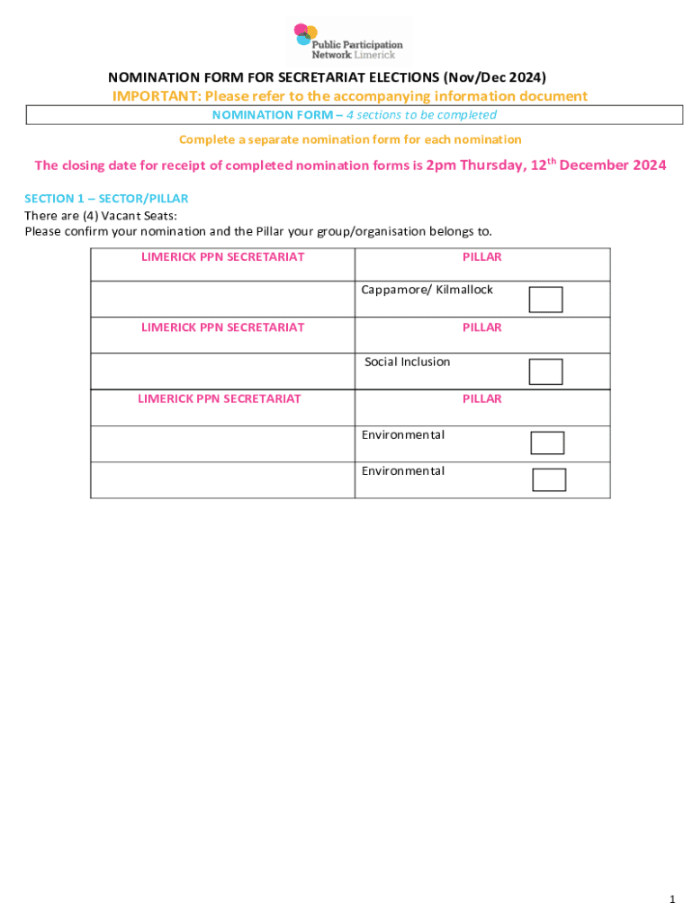 This document serves as a nomination form for individuals seeking election to the Limerick PPN Secretariat for the upcoming election in November/December 2024. It includes sections for details on