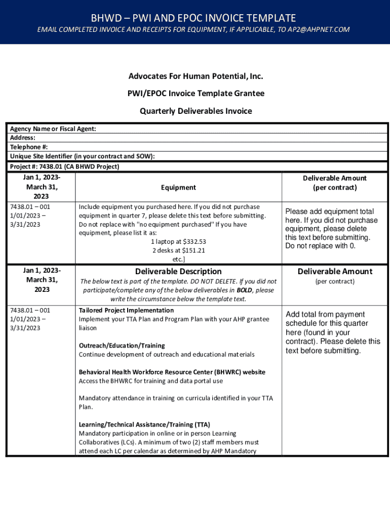 Template for grantees to submit invoices for quarterly deliverables, including instructions for submission and requirements for reimbursement of equipment purchases.