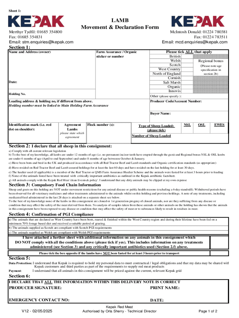 Este formulario se utiliza para la declaración y el movimiento de corderos, asegurando el cumplimiento de normativas y estándares, así como la recopilación de información sobre la propiedad,