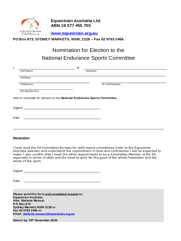 Nomination for Election to the National Endurance Sports Committee template instructions