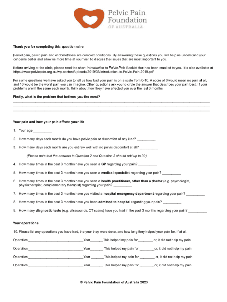 This document is a questionnaire designed to gather detailed information about an individual\'s experiences with pelvic pain, menstrual issues, and related medical history to better understand their