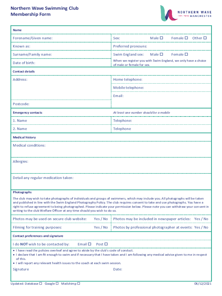 This document is a membership form for the Northern Wave Swimming Club, collecting personal, medical, and consent information from potential members.