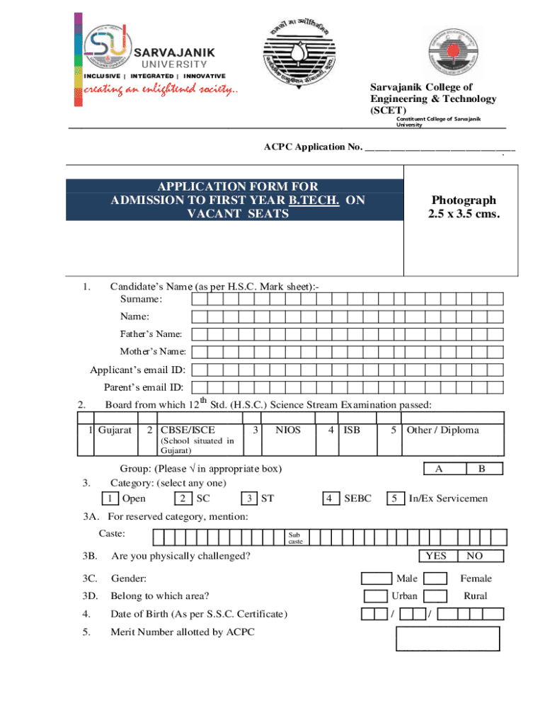 Get the free Application Form for Admission to First Year B.tech. on Vacant Seats - scet ac