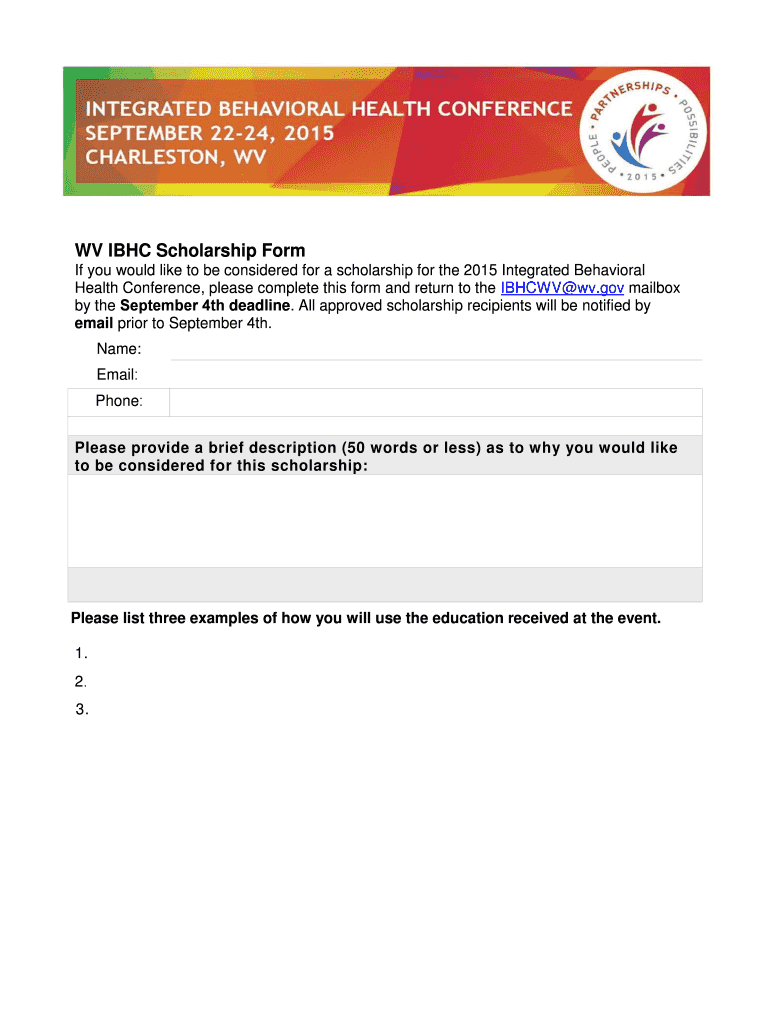 WV BHC Scholarship Form If you would like to be considered for a scholarship for the 2015 Integrated Behavioral Health Conference, please complete this form and return to the BCV WV.gov mailbox by