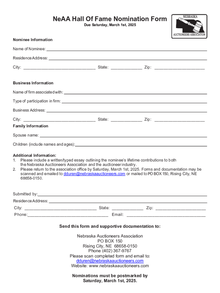 The NEAA Hall of Fame form is a crucial document in the nomination process. This form allows individuals to put forward nominees who have significantly impacted nursing education and the wider healthcare community. With its structured format, the form guides nominators through the necessary details and justifications needed for a thoughtful nomination.