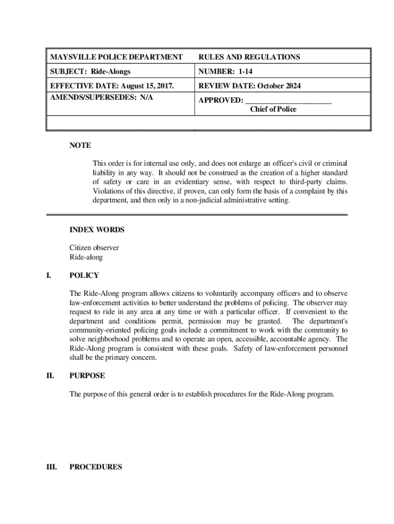 This document outlines the policies, procedures, and guidelines for citizens participating in the Ride-Along program with officers of the Maysville Police Department.
