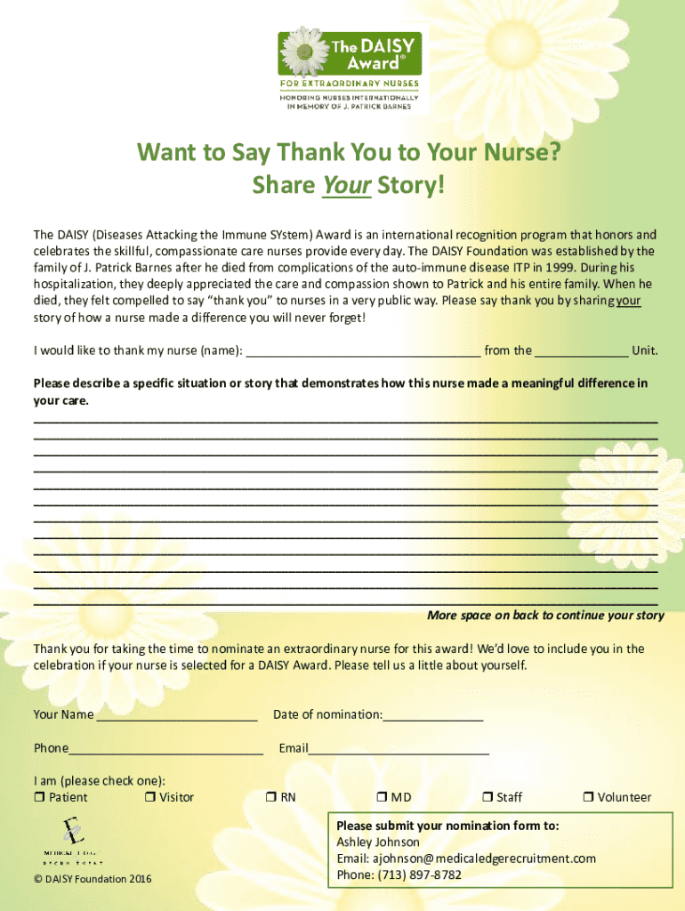 Typically, hospitals and healthcare organizations that wish to nominate a nurse for the DAISY Award are required to file the form.