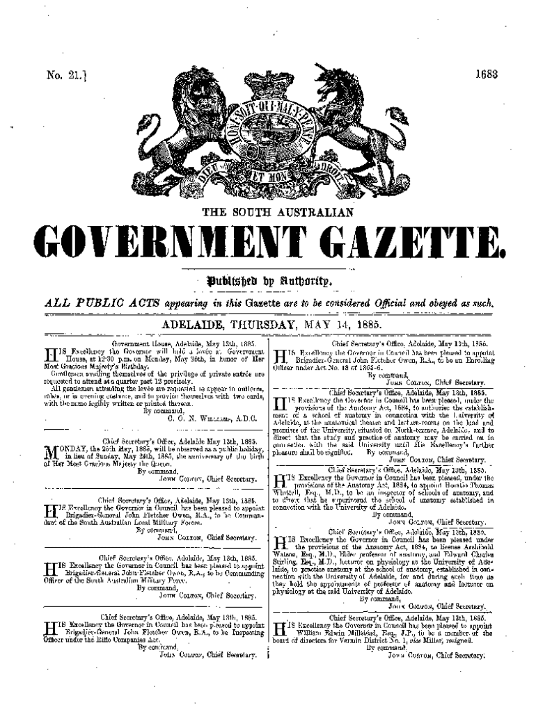 1683No. 21.1THE SOUTH AUSTRALIANGOVERNMENT GAZETTE. 1JubltSbtb bp autborttp. ALL P UBLIO .A. OTS appearing in this Gazette are to be considered Official and obeyed as such.ADELAIDE, THURSDAY, MAY