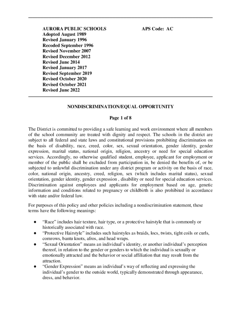 This document is a complaint form for reporting unlawful discrimination or harassment within Aurora Public Schools, helping to ensure compliance with nondiscrimination policies.