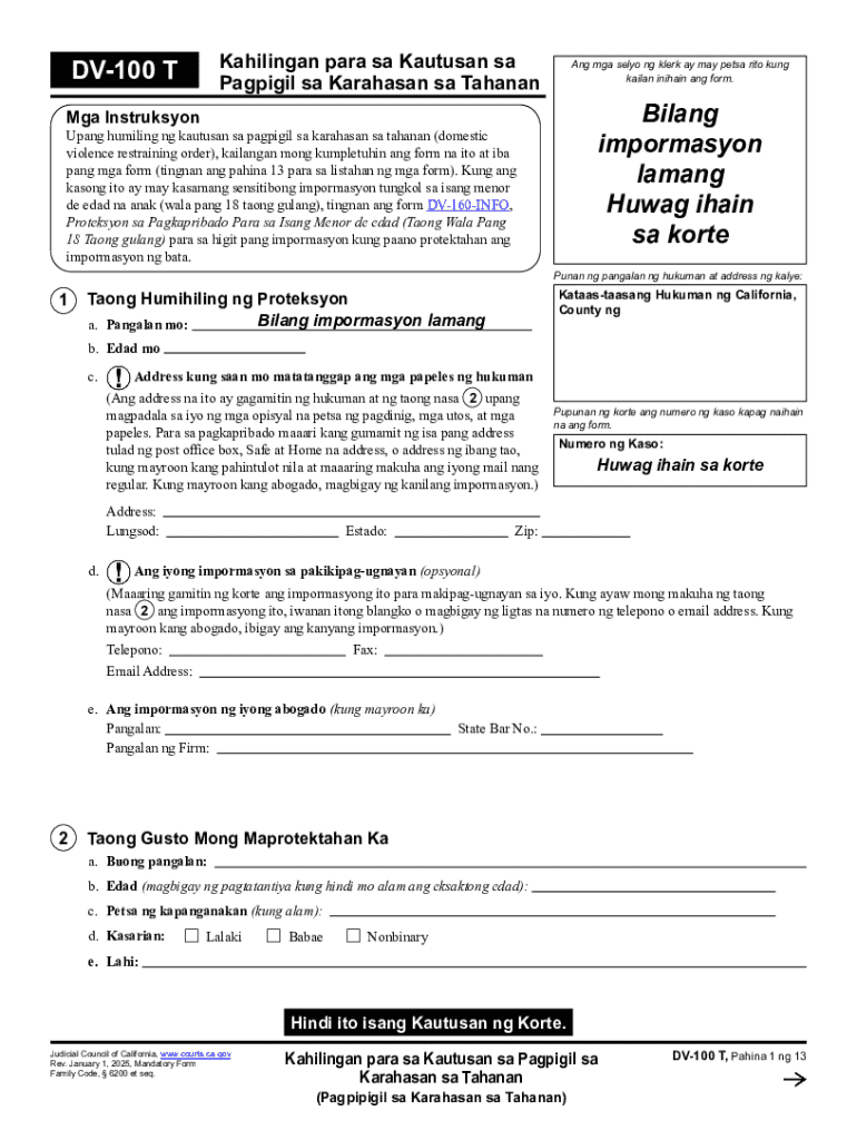 Ang dokumentong ito ay isang kahilingan para sa isang kautusan na naglalayong pigilan ang karahasan sa tahanan. Kinakailangan ng mga aplikante na kumpletuhin ito kasama ang iba pang mga form para