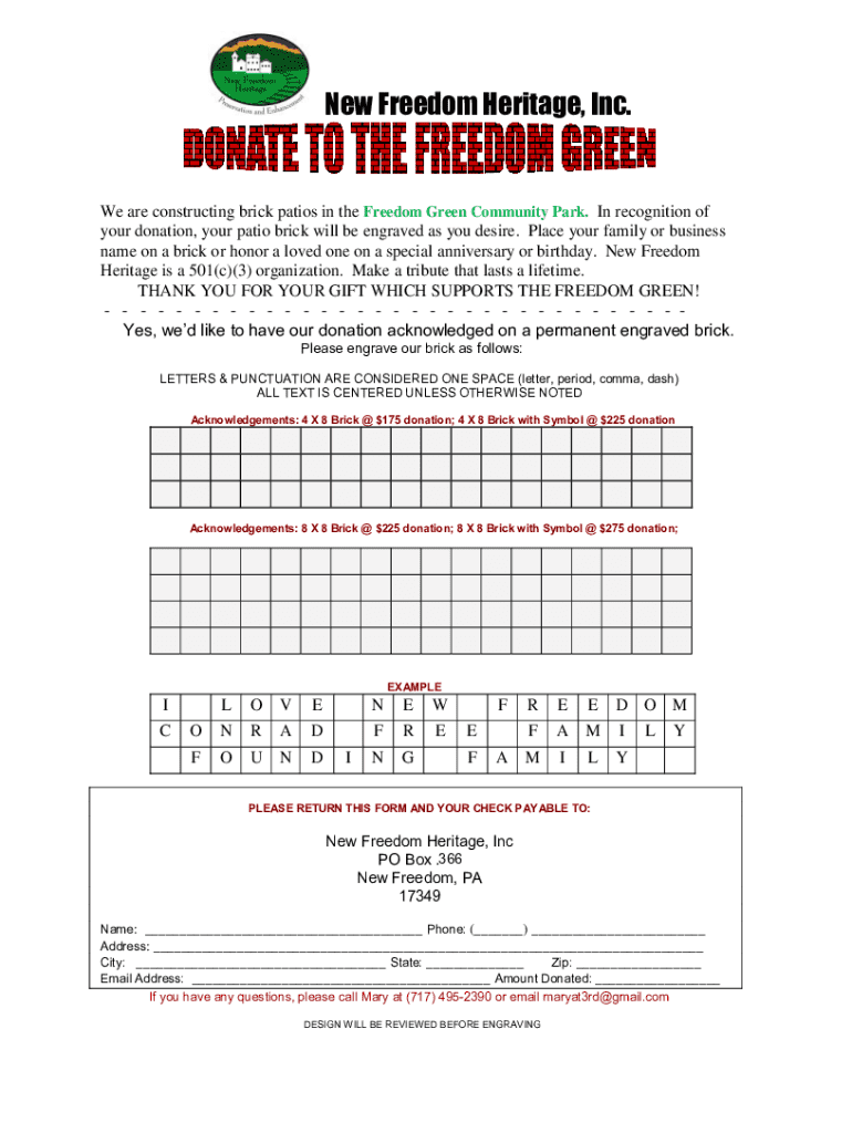 This document is a form for donors to purchase engraved brick patios in the Freedom Green Community Park, allowing them to honor a loved one or recognize their family or business through a lasting