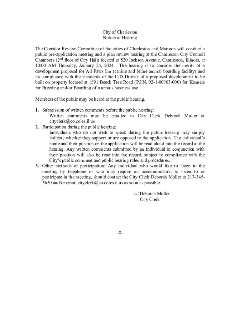 This document provides information about a public hearing conducted by the Corridor Review Committee to discuss a development proposal for All Paws Inn, an animal boarding facility, including details