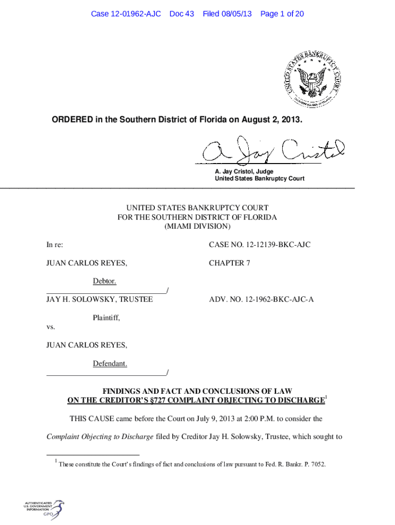 This document contains the Court\'s findings of fact and conclusions of law regarding the complaint filed by Jay H. Solowsky, Trustee, objecting to the discharge of Debtor Juan Carlos Reyes in a bankruptcy