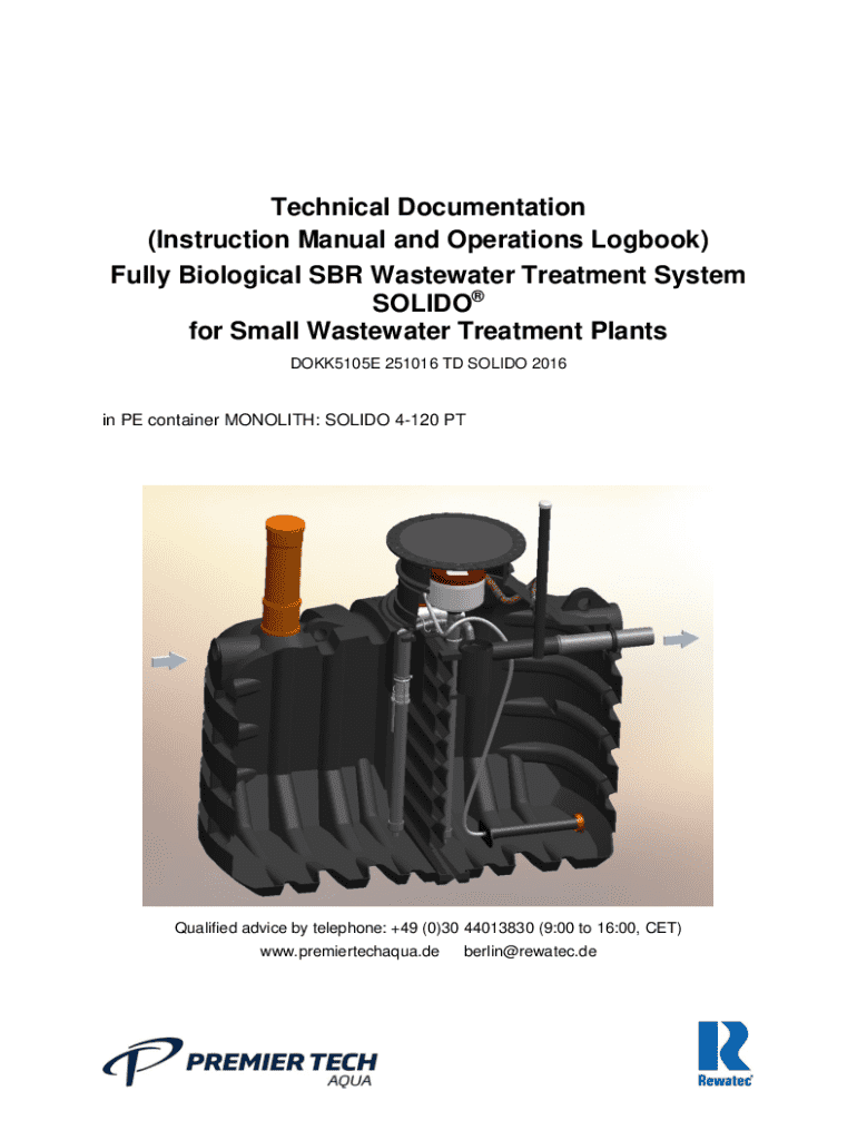 This document serves as a comprehensive instruction manual and operations logbook for the SOLIDO® SBR wastewater treatment system, detailing installation procedures, maintenance guidelines, safety