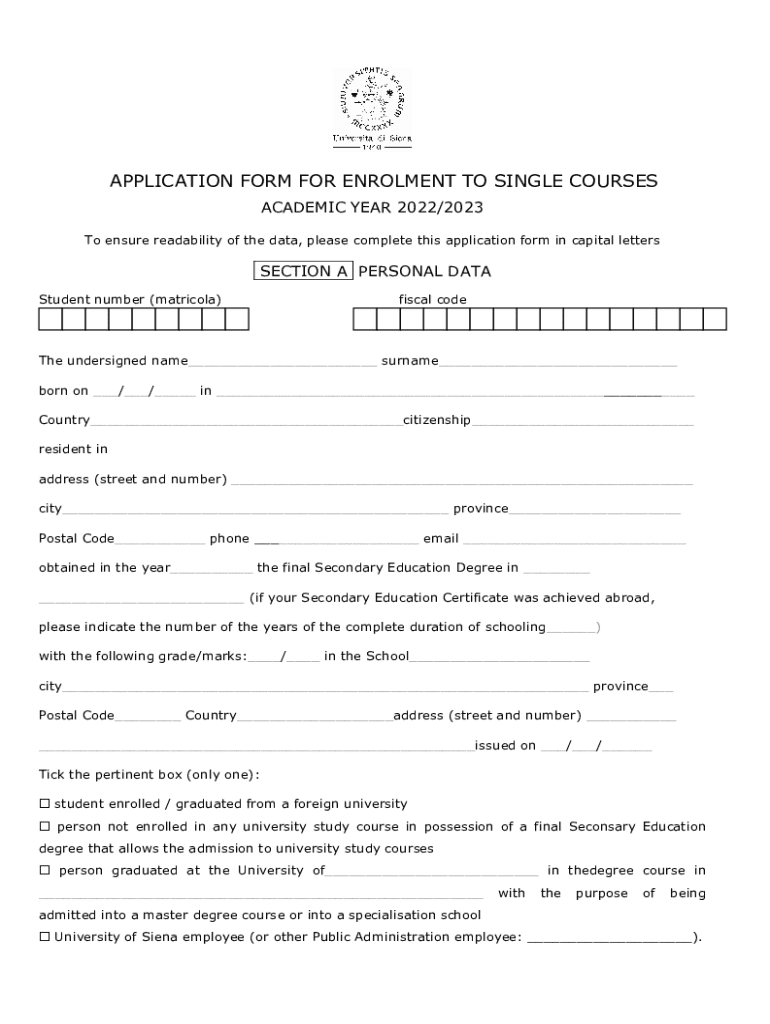 This document serves as an application form for students wishing to enroll in single courses for the academic year 2022/2023 at the University of Siena. It collects personal data, course preferences,