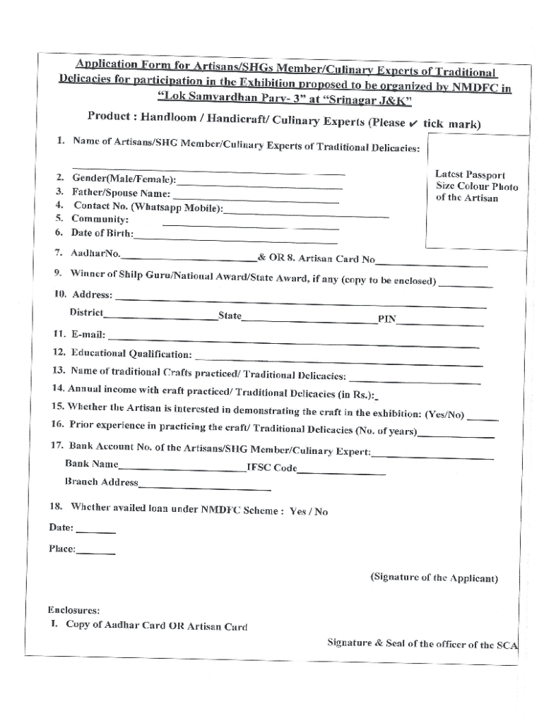 This document is an application form for artisans, SHG members, and culinary experts to participate in an exhibition organized by NMDFC in Srinagar, Jammu & Kashmir. It collects details such as personal