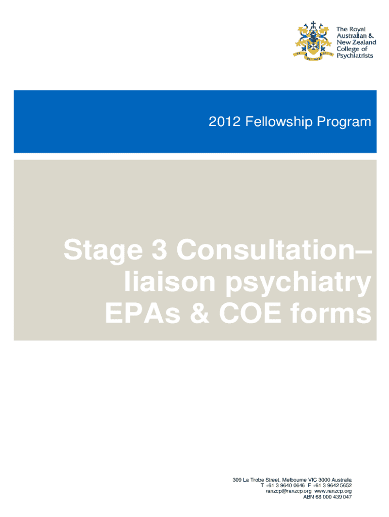 This document provides a collection of Entrustable Professional Activities (EPAs) and Confirmation of Entrustment (COE) forms for the Stage 3 training in consultation–liaison psychiatry, detailing