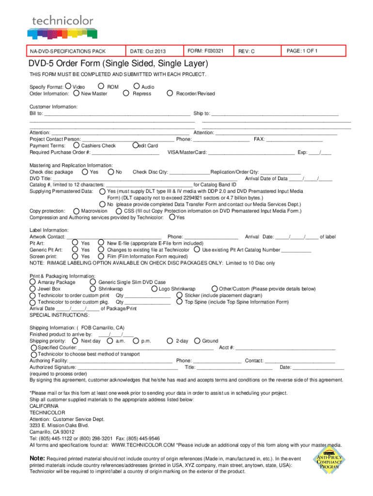 This document serves as an order form required for submitting projects related to DVD-5 mastering and replication, including customer information, payment terms, and project specifications.
