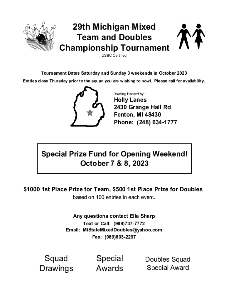 This document outlines the details for the 29th Michigan Mixed Team and Doubles Championship Tournament, including tournament dates, entry fees, rules, and prize fund details.