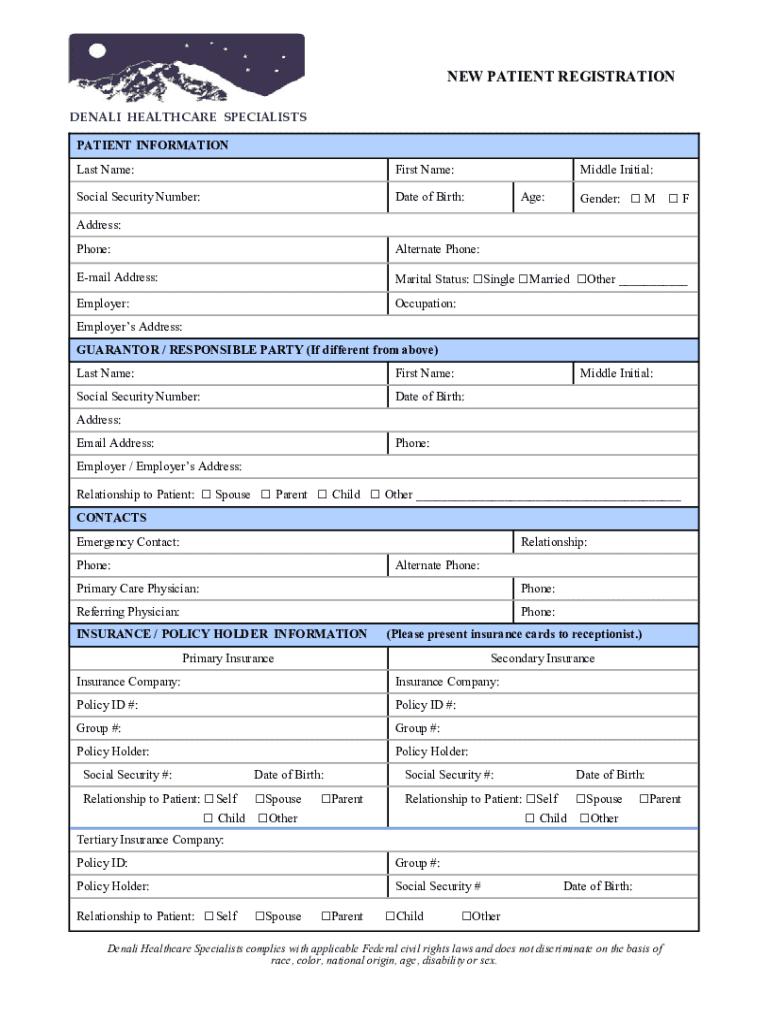 This document is for new patients to register with Denali Healthcare Specialists, providing personal, insurance, and medical information.