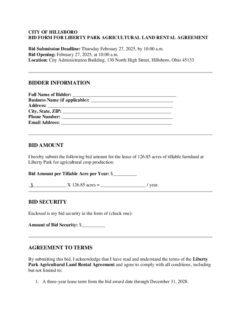 Get the free Bid Form for Liberty Park Agricultural Land Rental Agreement