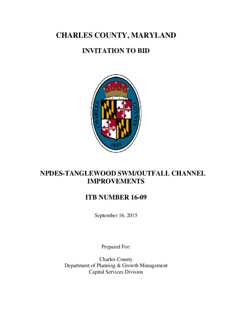 This document serves as an invitation to qualified contractors to submit sealed bids for the NPDES: Tanglewood SWM/Outfall Channel Improvements project, detailing the scope of work, contract provisions,