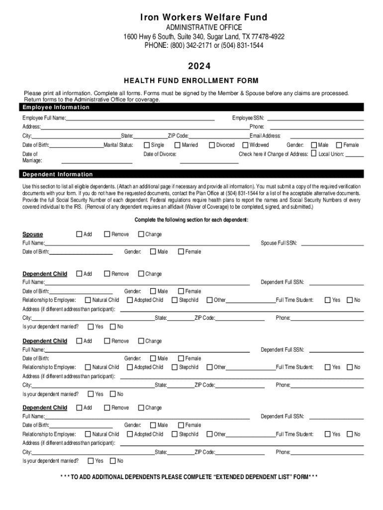 This document is a form for enrolling in the Iron Workers Welfare Fund\'s health insurance plan. It requires information about the employee, their spouse, and dependents. It must be filled out completely
