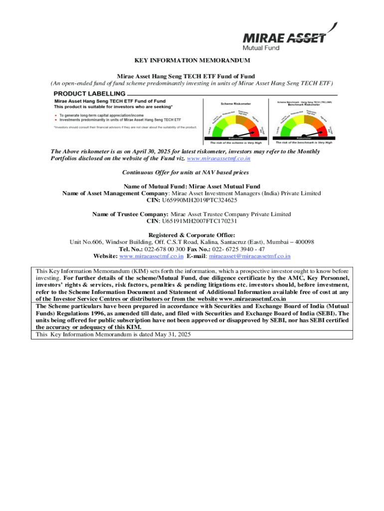 This document provides essential details regarding the Mirae Asset Hang Seng TECH ETF Fund of Fund, including investment objectives, risk factors, and operational guidelines for prospective investors.