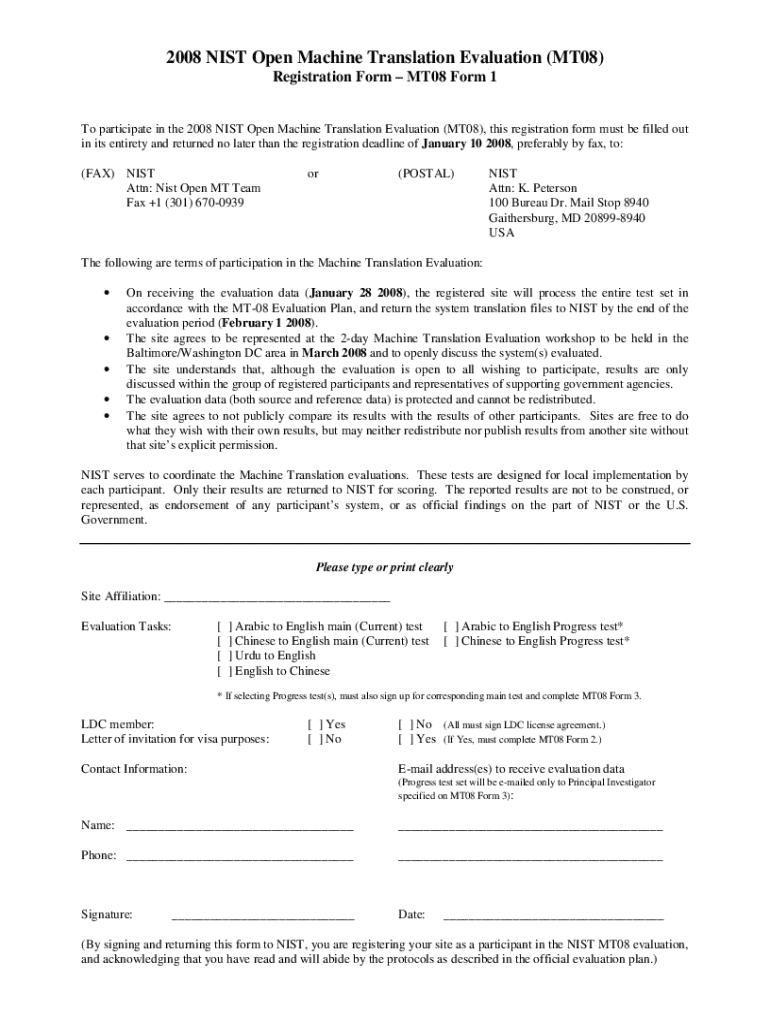 Get the free 2008 Nist Open Machine Translation Evaluation Registration Form