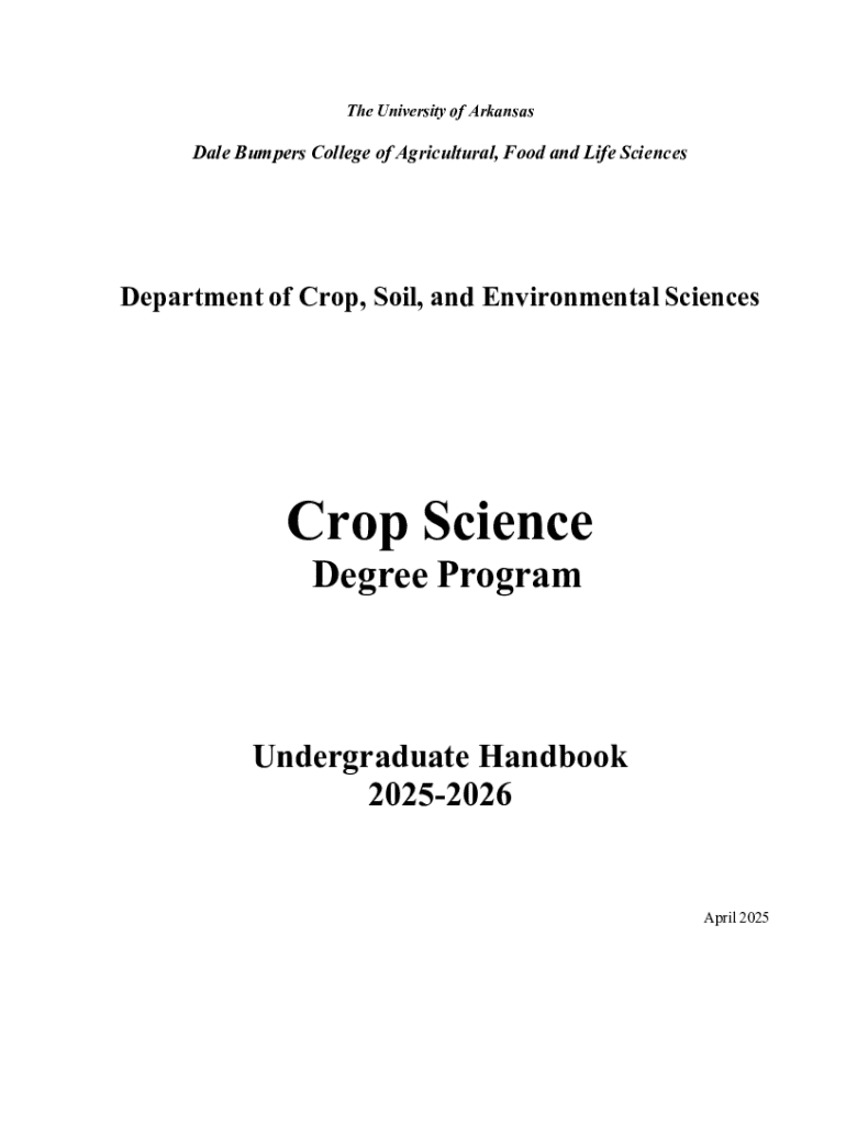 This handbook serves as a comprehensive guide for students pursuing a degree in Crop Science within the Department of Crop, Soil, and Environmental Sciences at the University of Arkansas. It includes