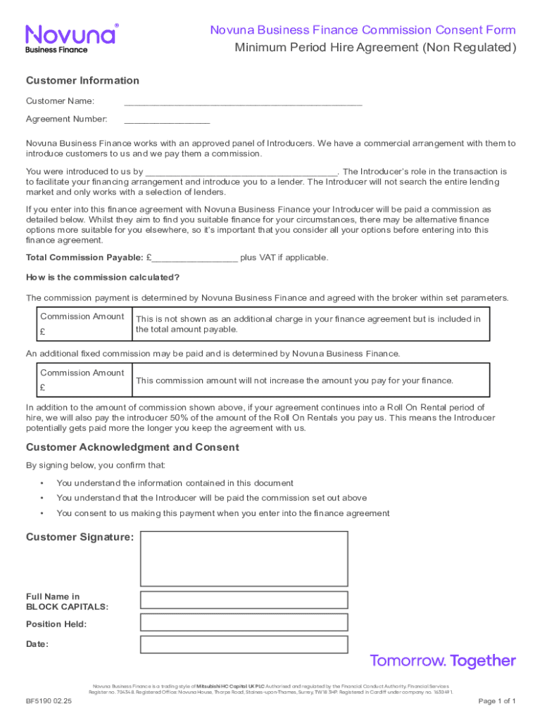 The Novuna business finance commission form serves as a vital tool for businesses seeking to manage their financial operations effectively. This form is designed to facilitate the process of securing finance for various business needs, whether it's expanding operations, purchasing inventory, or investing in new technologies. It acts as a formal request for access to funds, making it necessary for businesses to ensure that all required information is provided accurately and comprehensively.
