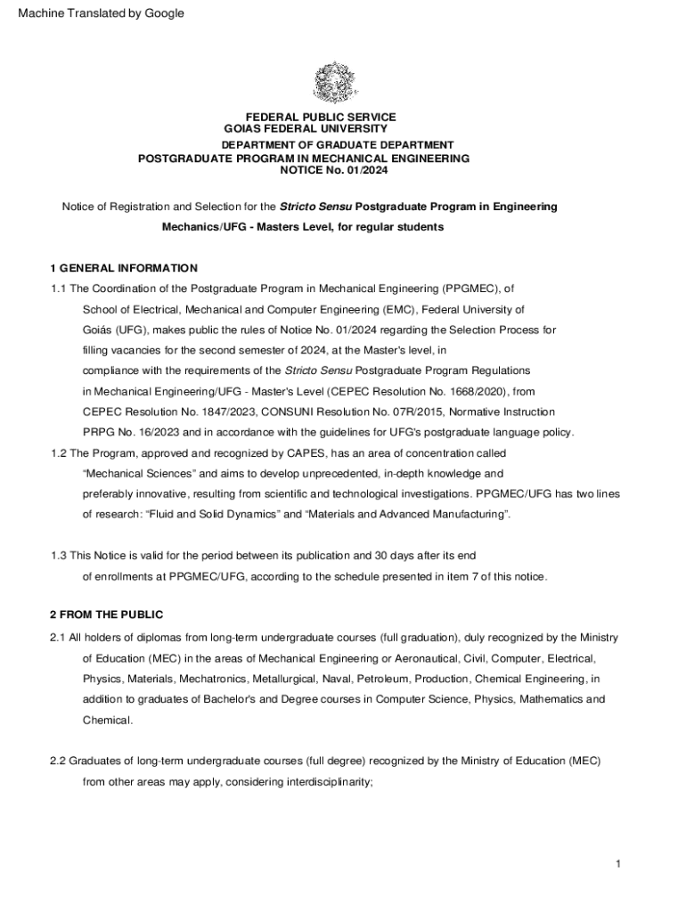 Este aviso estabelece as regras para o Processo Seletivo de preenchimento de vagas para o Programa de Pós-Graduação Stricto Sensu em Engenharia Mecânica da Universidade Federal de Goiás, a nível