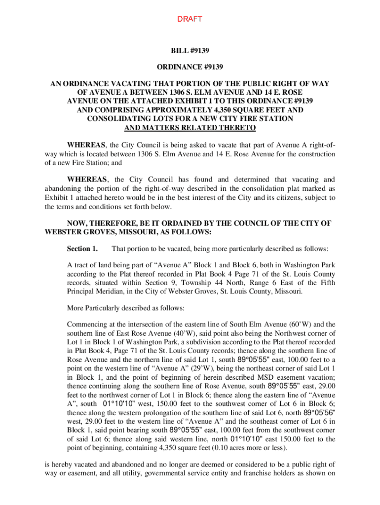 This ordinance pertains to the vacation of a portion of the public right-of-way of Avenue A in Webster Groves, Missouri, for the construction of a new city fire station, detailing land descriptions