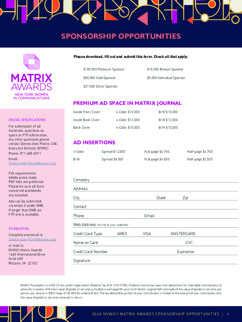 This document outlines the sponsorship opportunities for the 2024 Matrix Awards, hosted by New York Women in Communications, highlighting the importance of female empowerment in the communications