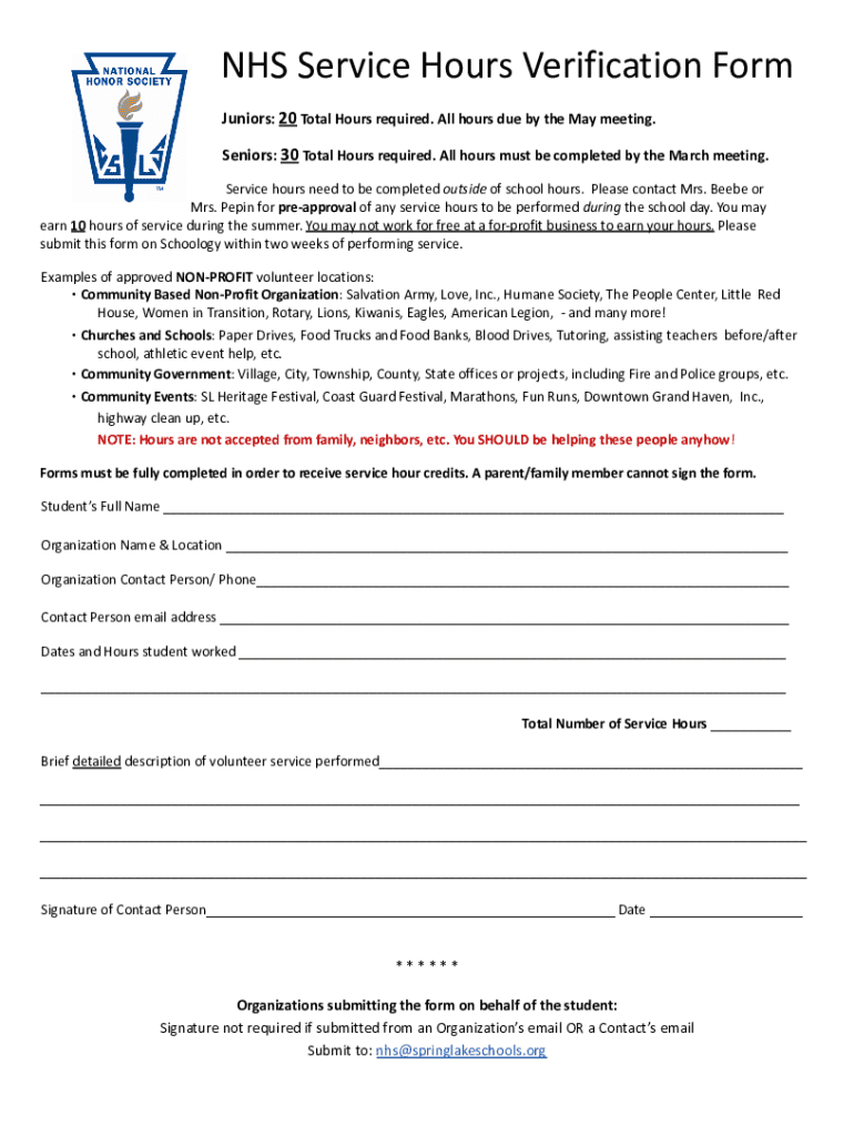 This form is used to verify service hours completed by students for the NHS program, including requirements and guidelines for acceptable volunteer activities.