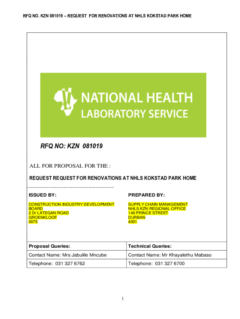 This document is a Request for Quotation (RFQ) for renovations at the NHLS Kokstad Park Home, detailing the requirements, proposal procedures, and evaluation criteria for contractors to submit their