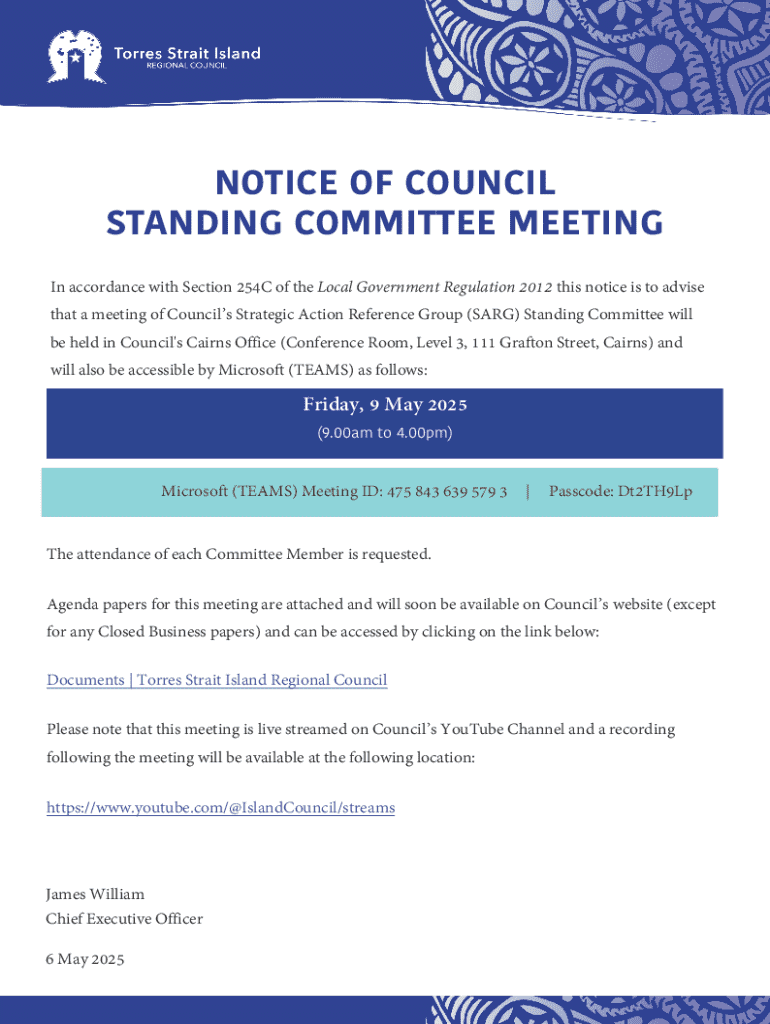 Get the free Notice of Council Standing Committee Meeting - tsirc qld gov