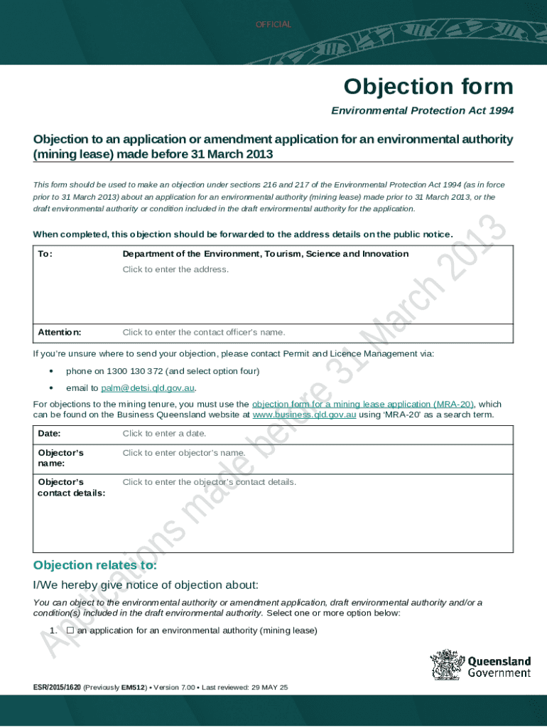 How to fill Objection to an application or amendment application for an environmental authority (mining lease) made before 31 March 2013. This should be used to make an objection under sections 216 and 217 of the Environmental Protection Act 1994 (as in for word template